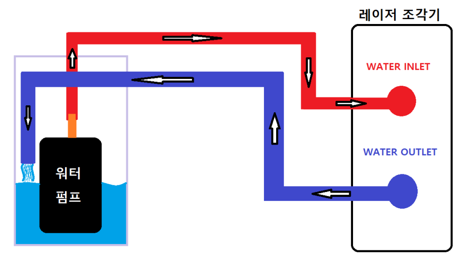 워터펌프에서는 물이 올라와서 레이저 조각기로 물이 들어가고,