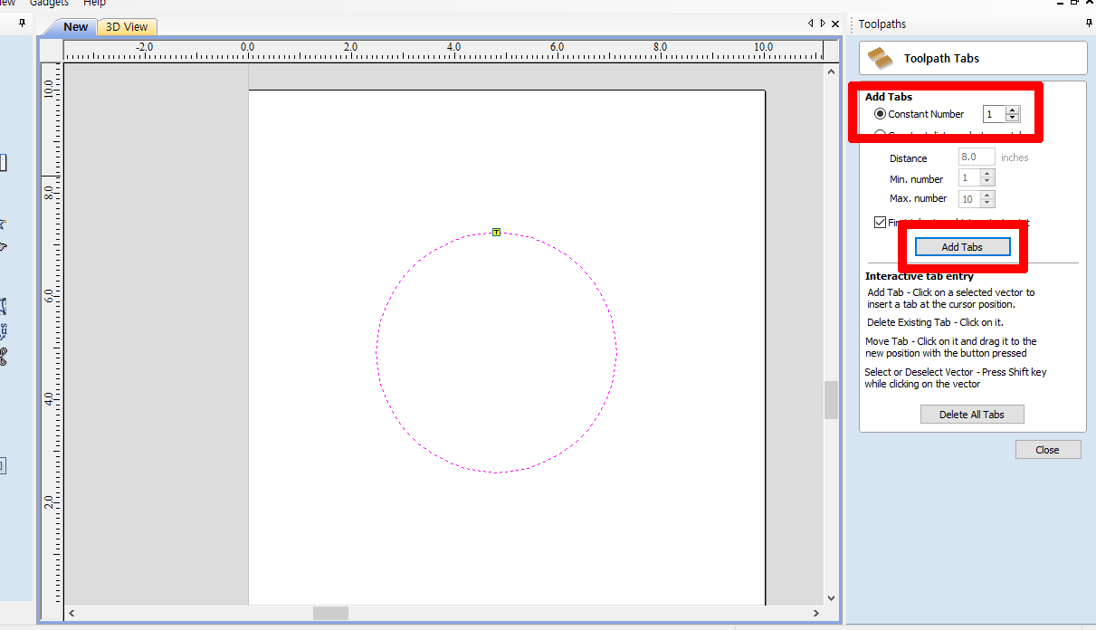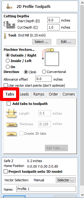 Toolpath 메뉴 하단에 보시면 Tabs라는 탭이 있습니다.