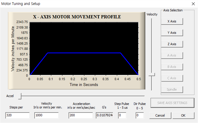 사용하시는 스크류, 모터, 모터 드라이버 세팅 등에 따라 Mach3의 스텝 값을 설정해줘야 합니다.