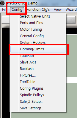 'Config'을 클릭 후, 'Homing/Limits' 를 클릭합니다.