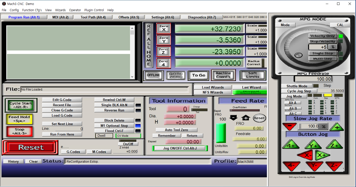 먼저 Mach3 프로그램을 실행시킨 후, 키보드의 TAB 키를 눌러주세요.