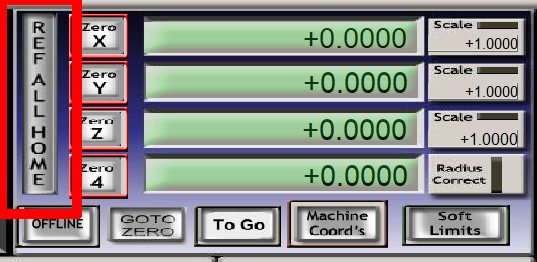 좌측 빨간 박스의 'REP ALL HOME' 을 클릭하여 X, Y, Z 축이 기계 원점으로 이동하도록 합니다.