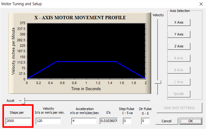이 값을 Motor Tuning의 Steps per에 넣어줍니다.