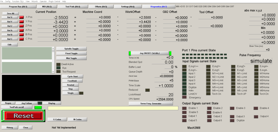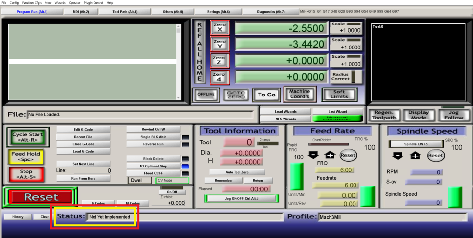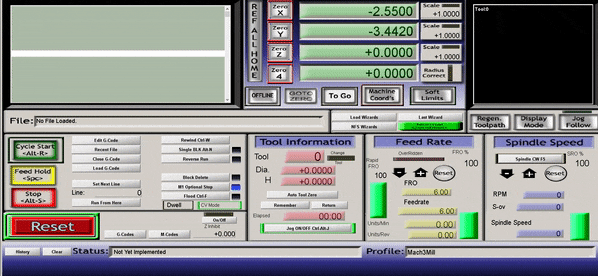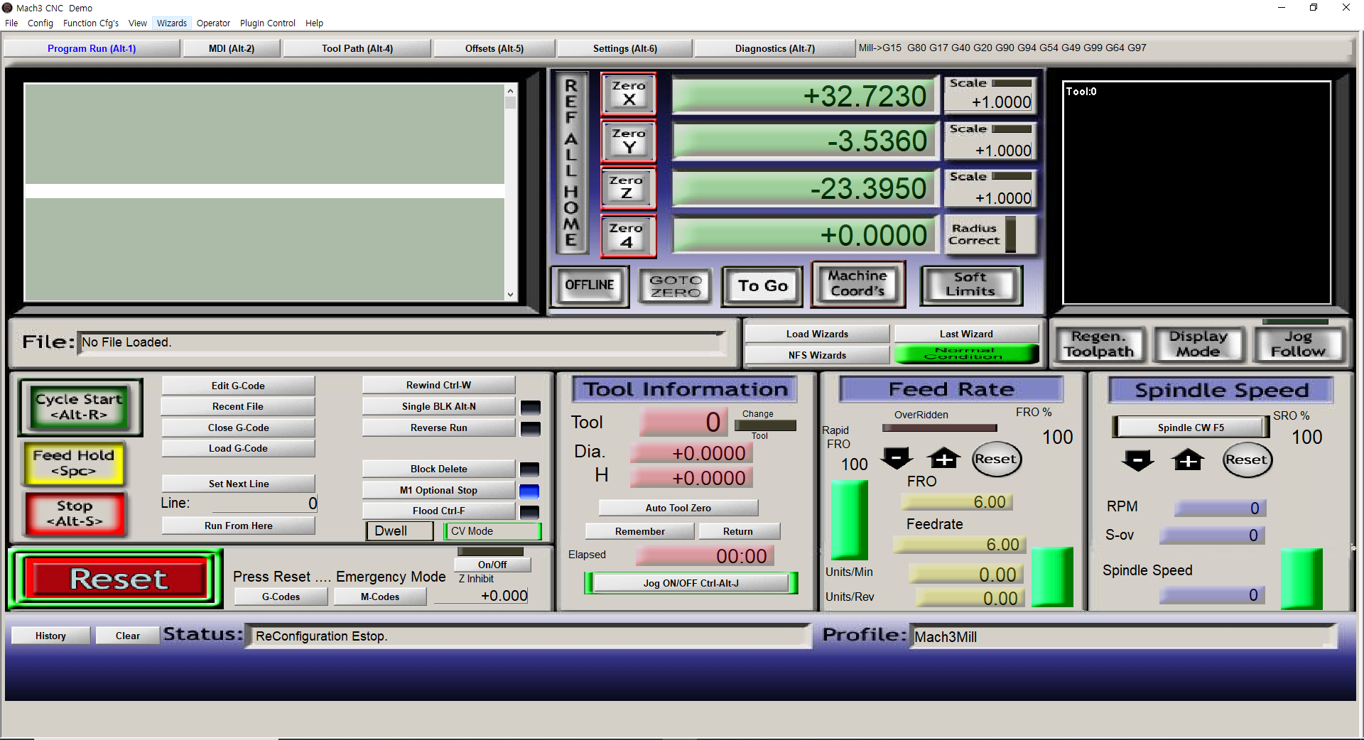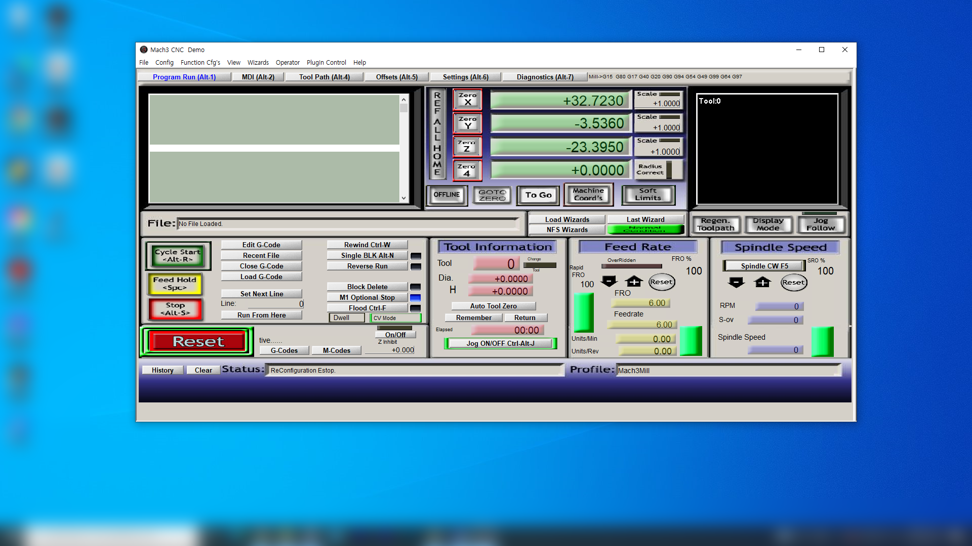 마하3(Mach3Mill)를 실행하시면 보통 이렇게 창모드로 프로그램 화면이 나타납니다.