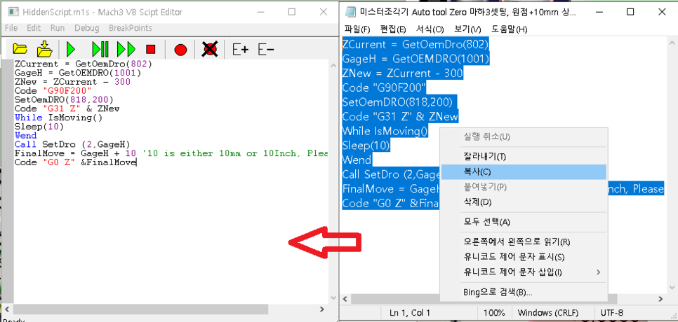 이제 Auto Tool Zero 버튼이 작동 할 수 있도록 코드를 복사해서 넣어 주셔야 합니다.