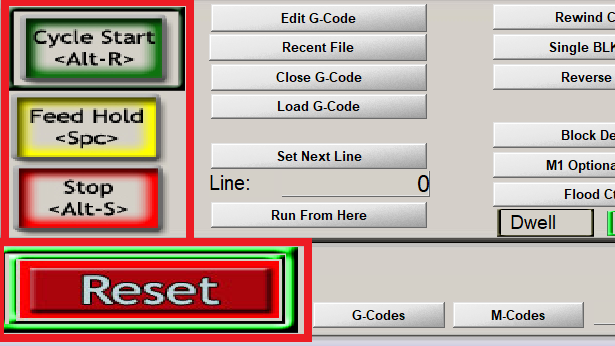 Reset : 가공을 정지하고, 마하3의 기능을 모두 정지시키는 버튼입니다.