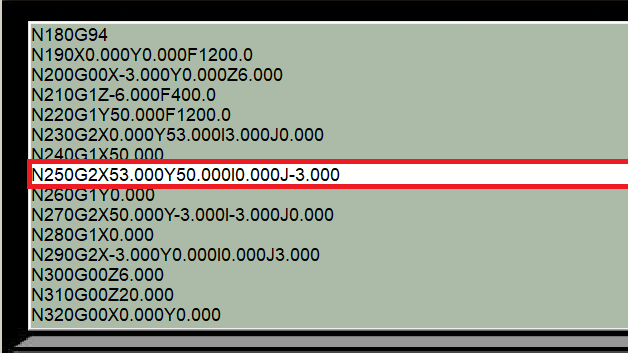 'N250G2X53.000Y50.000I0.000J-3.000'에 멈춰있는 것을 보실 수 있습니다.