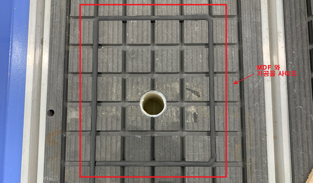 빨간 사각형으로 표시해둔 점이 추후에 흡착을 할 MDF와 가공물 사이즈 입니다.