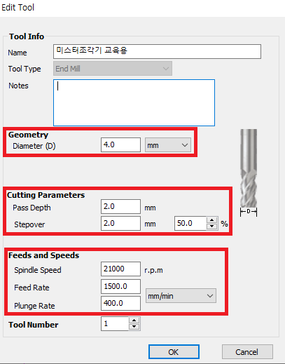 - Diameter : 엔드밀의 날경(재료에 닿는 부분의 지름)을 입력 해 줍니다.